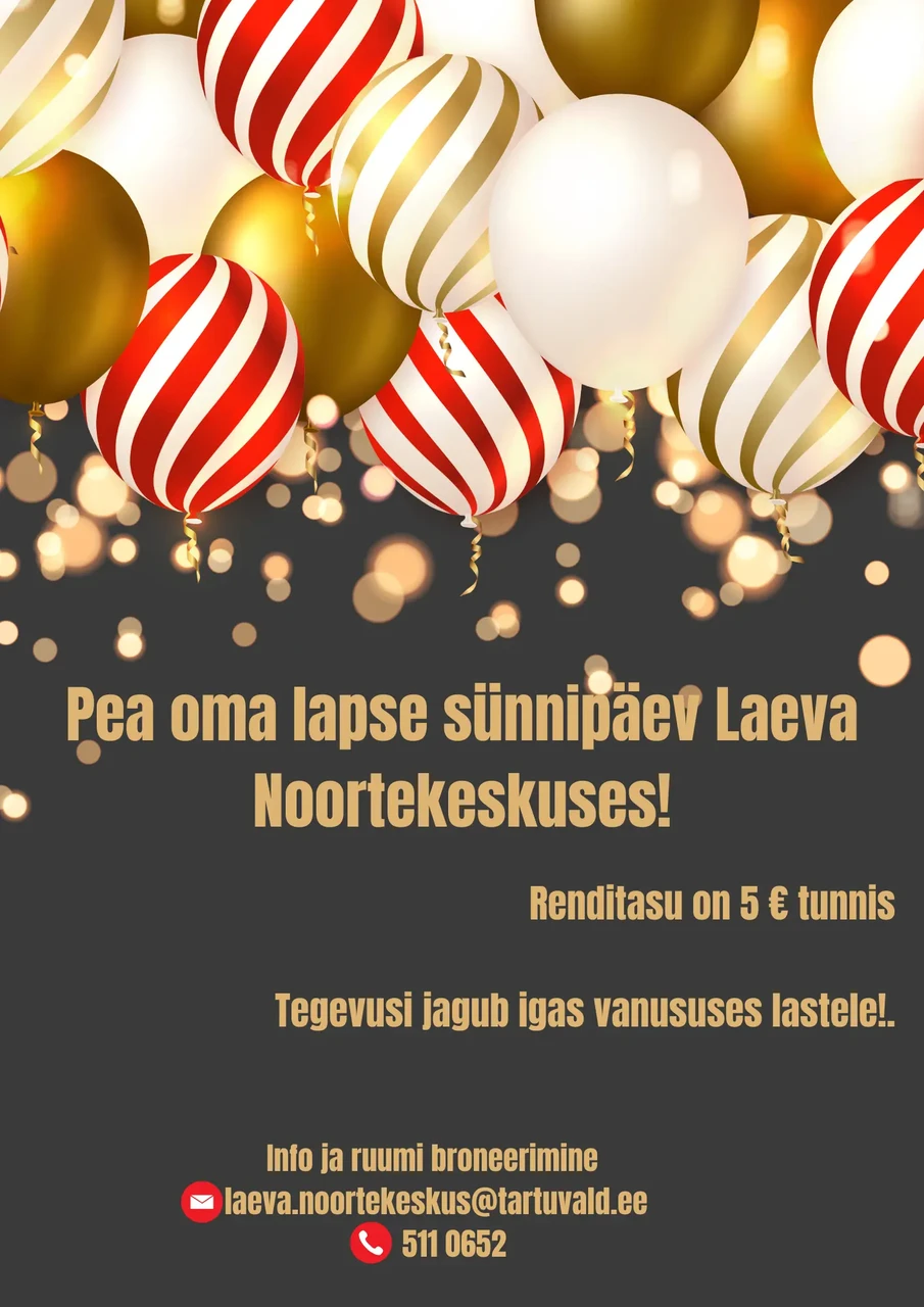 Tähista oma lapse sünnipäeva Laeva Noortekeskuses! Meie hubased ruumid ja mitmekesine inventar pakuvad palju võimalusi, et muuta pidu meeldejäävaks ja lõbusaks. Kogu noortekeskus on teie käsutuses ning mängimiseks on olemas nii lauamängud kui ka piljard, lauatennis ja palju muud.